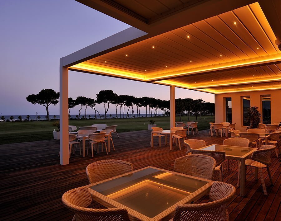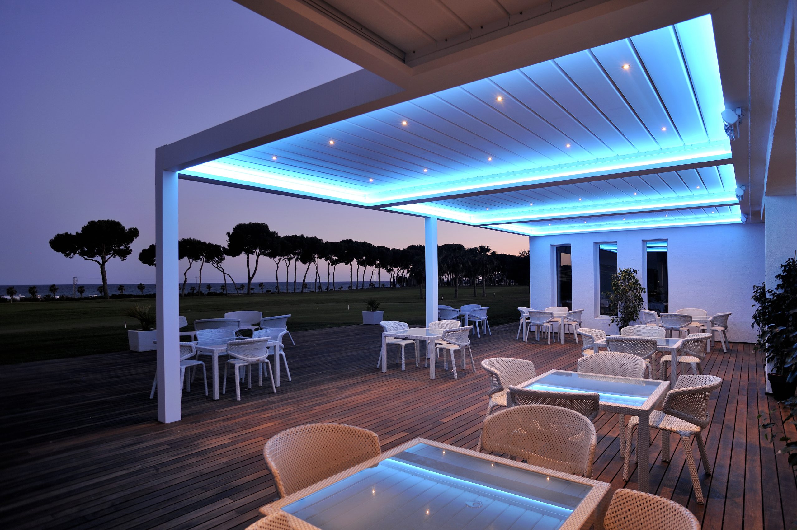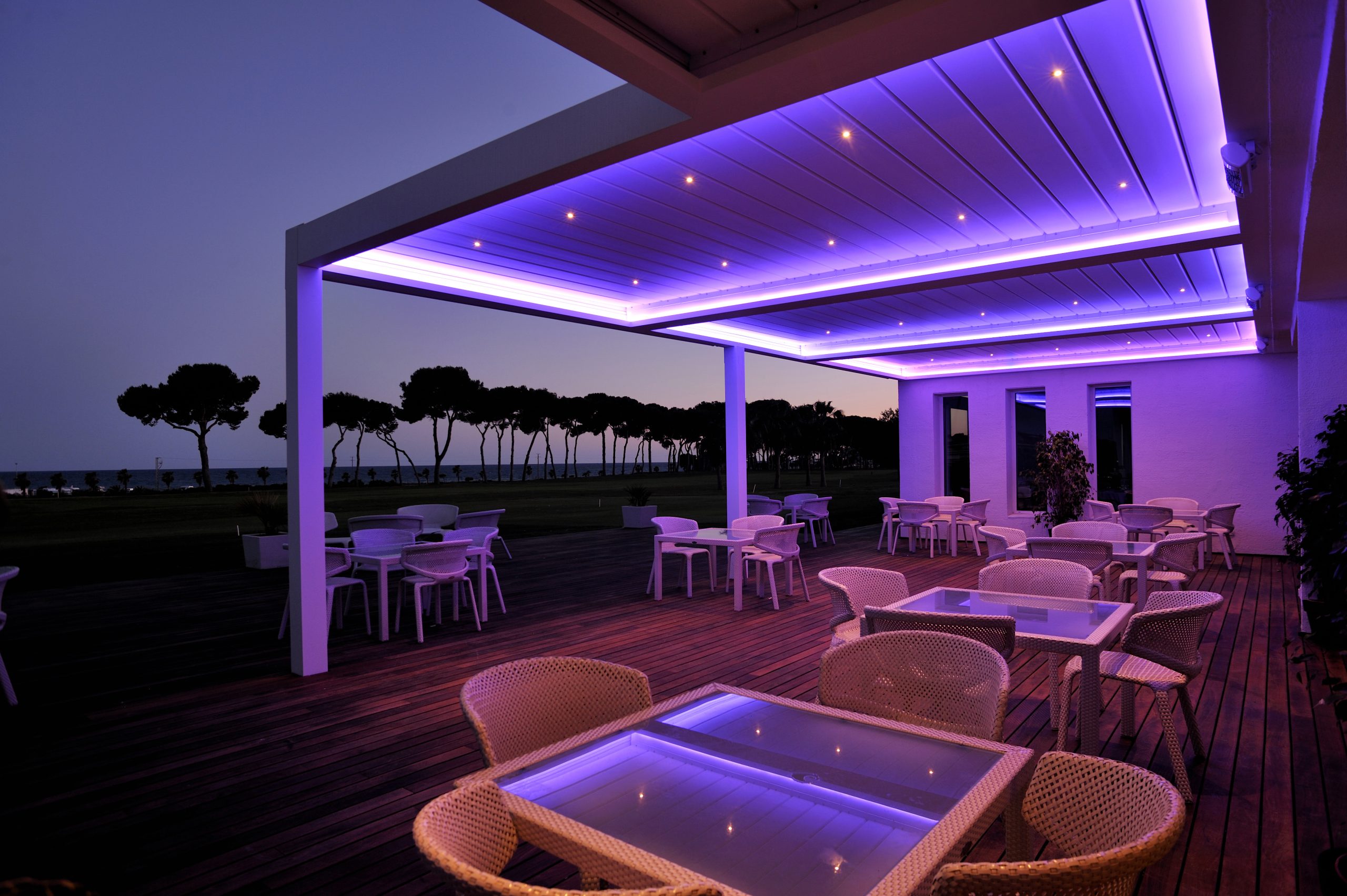 Crear ambientes diferentes nunca fue tan sencillo. Estos son algunos de los colores de la iluminación LED de nuestra pérgola bioclimática en el Club de Golf Terramar de Sitges (Barcelona).
